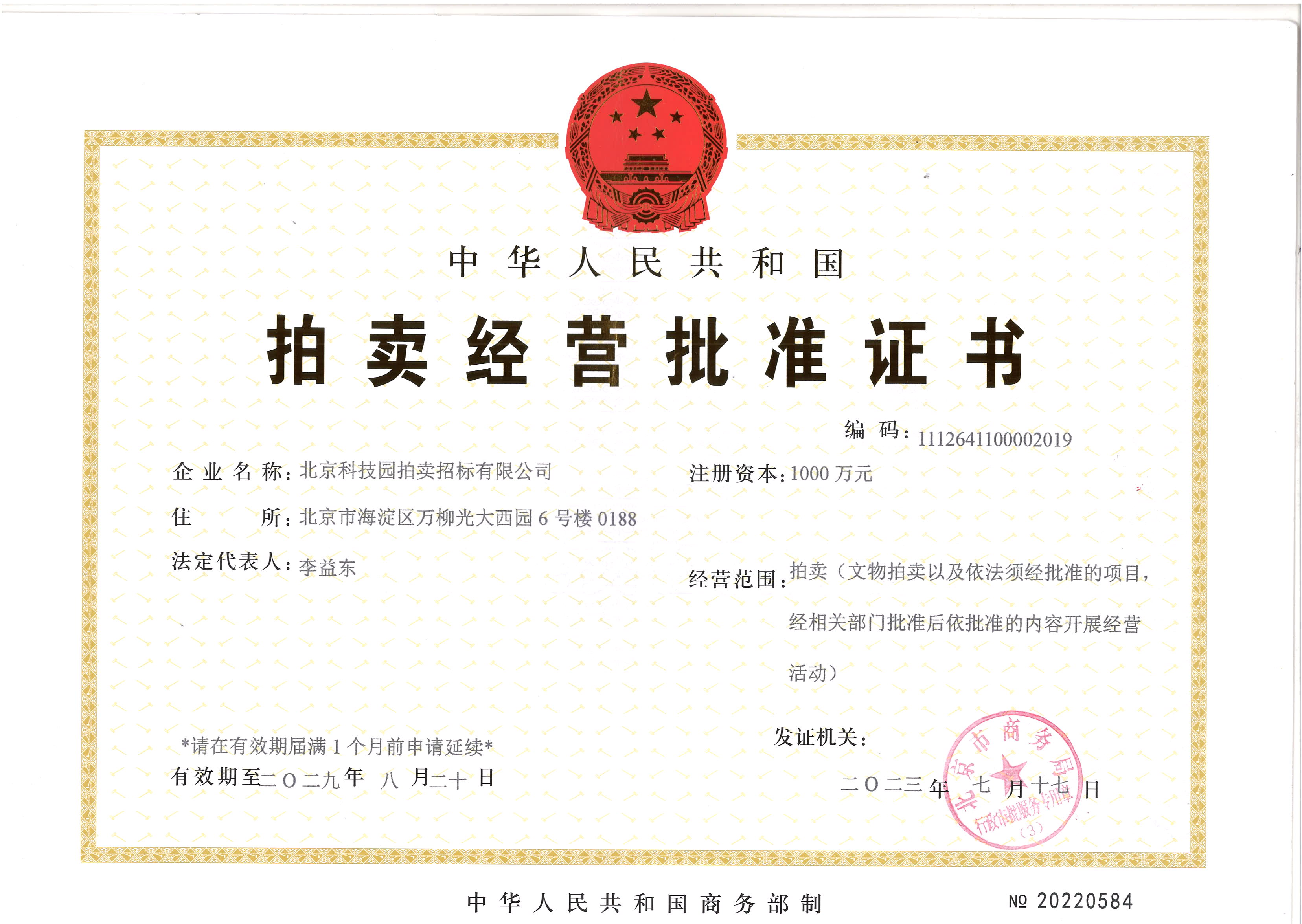拍賣經(jīng)營批準(zhǔn)證書