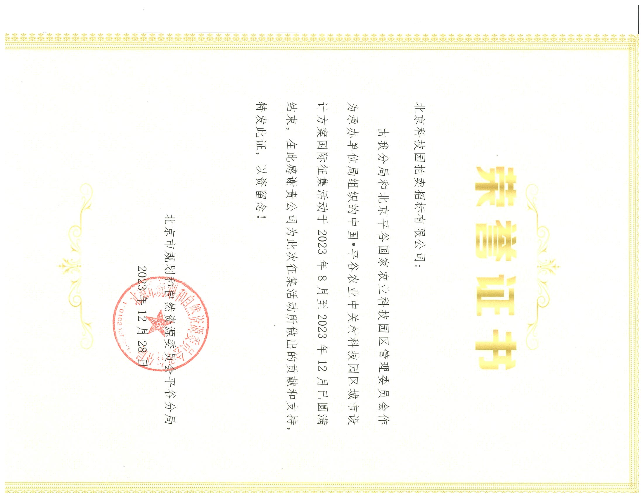 • 中國·平谷農(nóng)業(yè)中關(guān)村科技園區(qū)城市設(shè)計方案國際征集榮譽證書