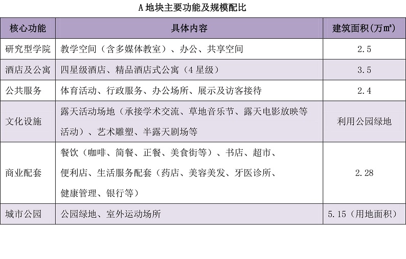 核心功能:研究型學(xué)院、酒店及酒店式公寓、公共服務(wù)、文化設(shè)施、配套商業(yè)、城市公園。