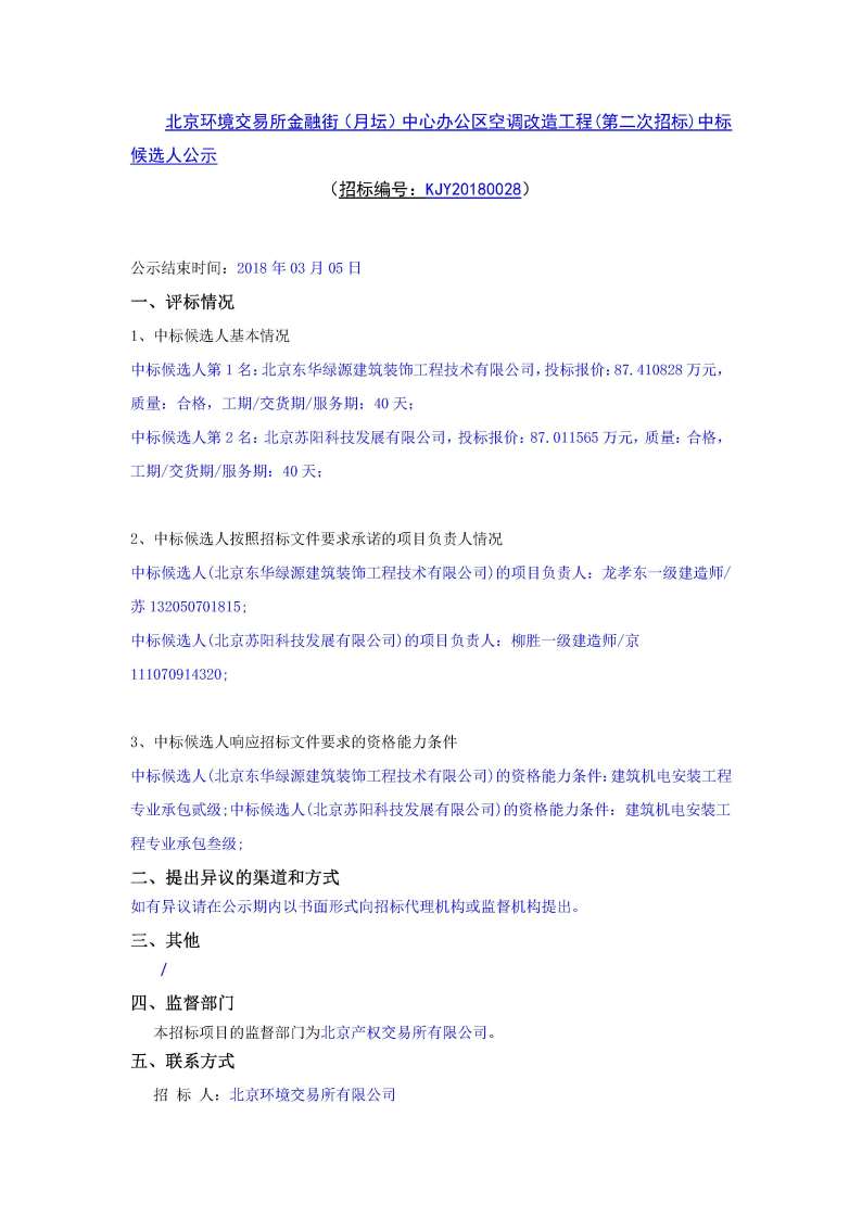 北京環(huán)境交易所金融街(月壇)中心辦公區(qū)空調(diào)改造工程(第二次招標(biāo))中標(biāo)候選人公示