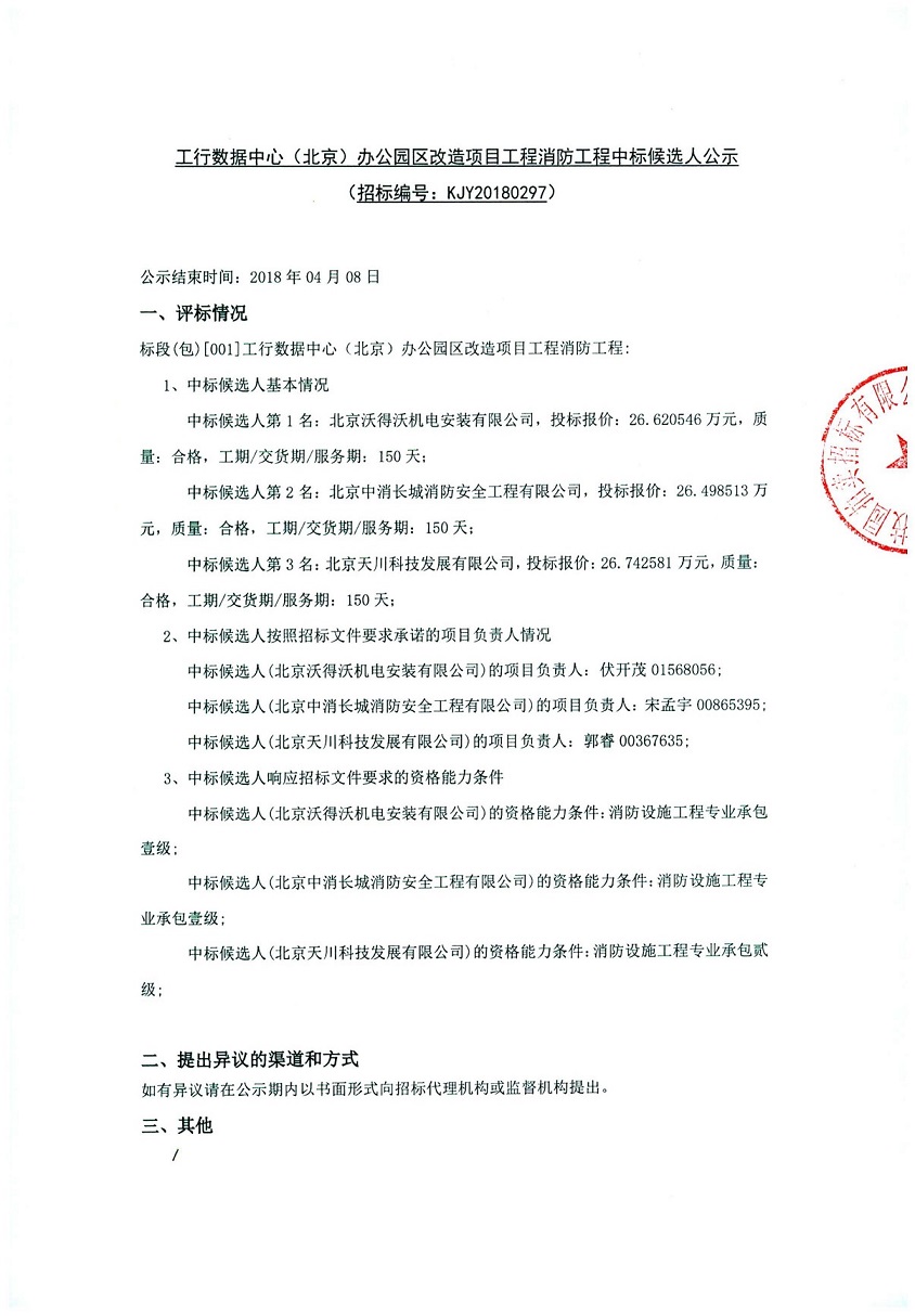 工行數(shù)據(jù)中心(北京)辦公園區(qū)改造項目工程消防工程中標候選人公示