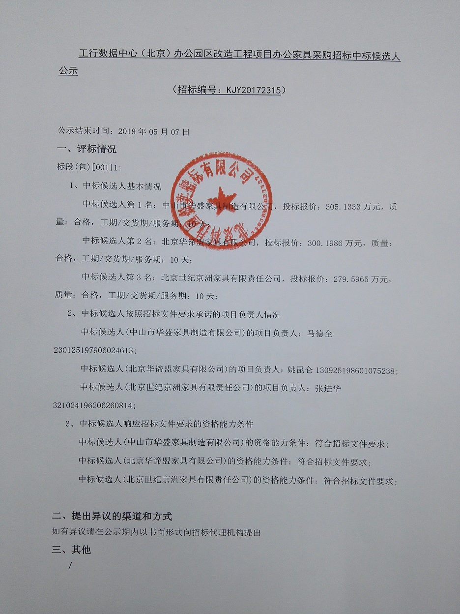 工行數(shù)據(jù)中心(北京)辦公園區(qū)改造工程項目辦公家具采購招標(biāo)中標(biāo)候選人公示